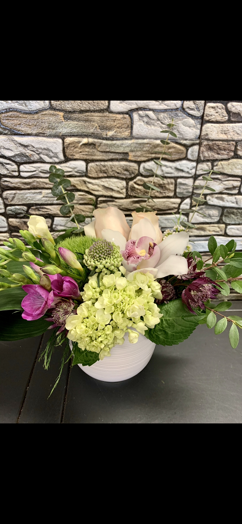 Beautiful soft coloured flowers with a pop of purples arranged in a white vase